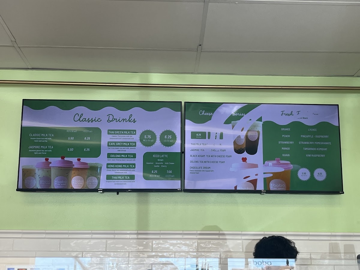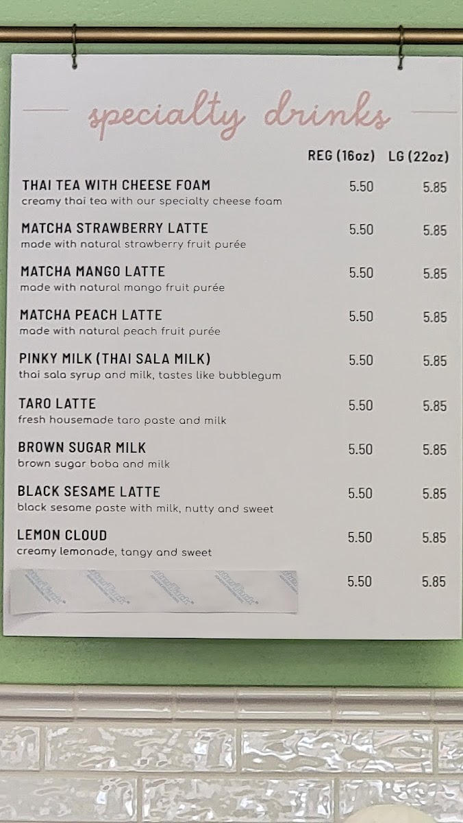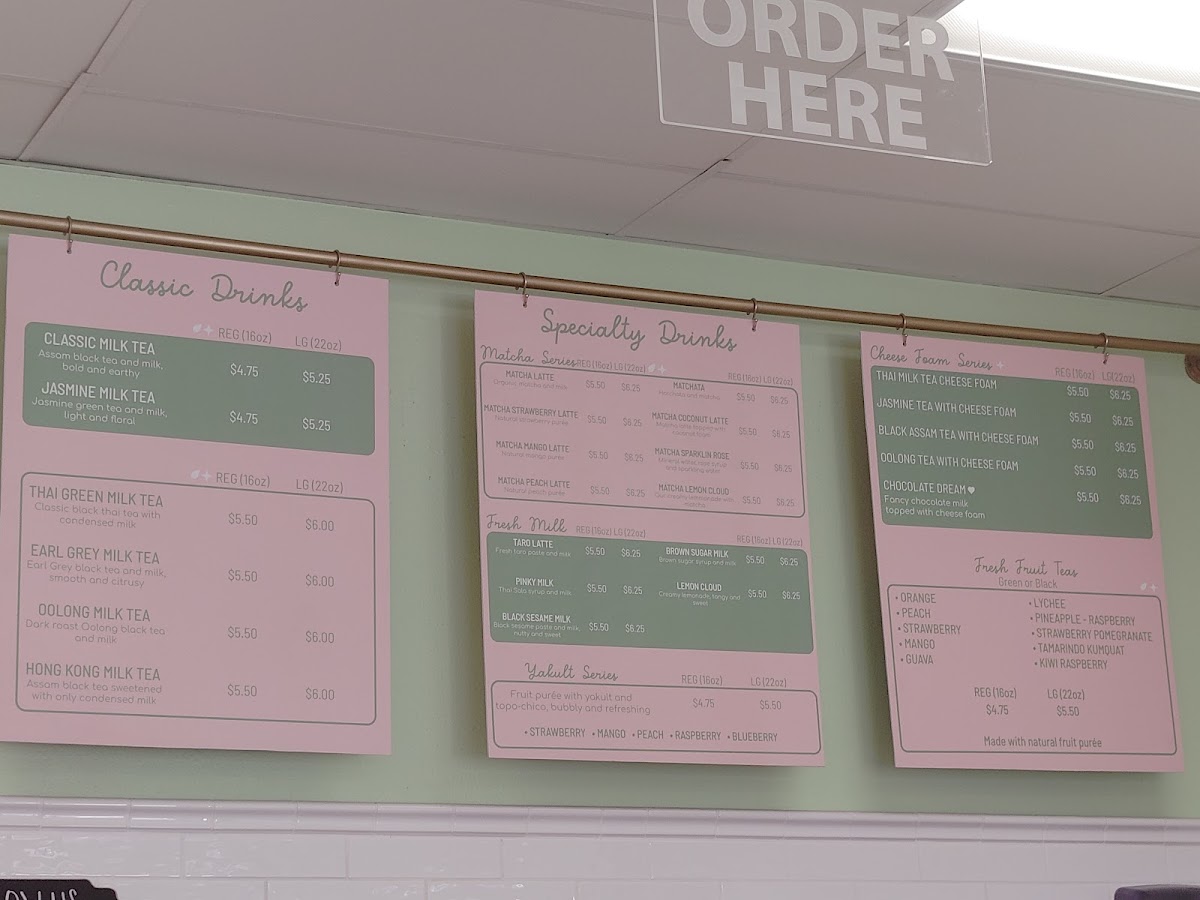 The menu is well-suited for casual visits to enjoy a variety of brewed tea beverages with customizable options such as boba pearls, jelly, and other toppings commonly associated with this category. These selections are appropriate for coffee breaks, light refreshments, or quick beverage orders throughout the day.